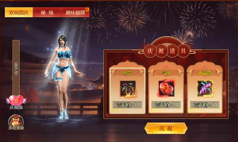 活动内容:活动期间内,参与欢祝国庆、秘境、趣味翻牌,可获得彩带、礼花筒等诸多福利奖励,使用庆祝道具可提升庆祝值,庆祝等级达到指定等级可获得钻石、叹美华夏专属称号奖励;