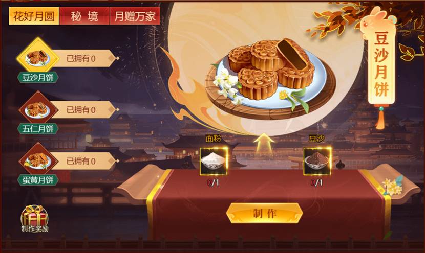 活动内容:活动期间内,参与花好月圆、秘境、月赠万家,可获得面粉、豆沙等制作材料,制作不同类型的月饼,将可获得海量钻石奖励。同时捐赠月饼,更有超丰富的全服进度奖励。